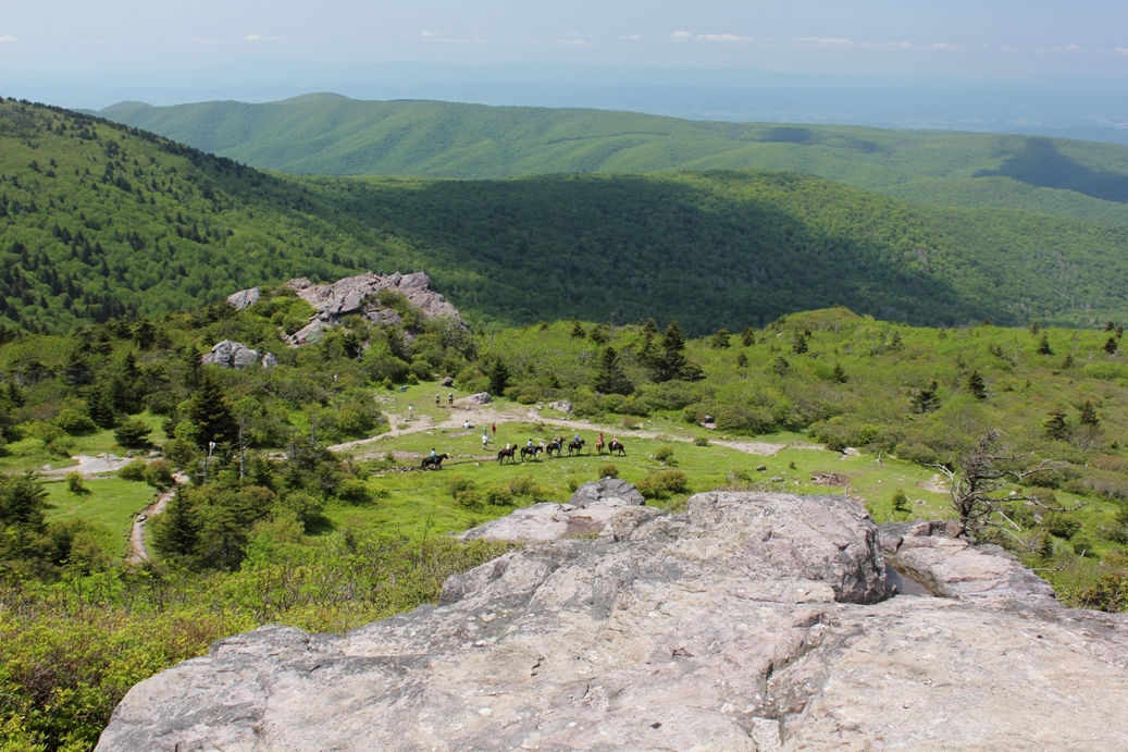 At the northern end of Wilburn Ridge, you can look west back down towards the valley and ridge section of Virginia. In the photo below, you can see where the Appalachian Trail, Crest Trail, and Pine Mountain Trail intersect. Click to enlarge this photo and you can see the horses and riders on the trail. Iron Mountain is the long straight mountain behind them that runs along the top of the picture. In the very upper left of the photo is the valley back towards Abingdon. While not visible in this photo, Abingdon is less than 30 miles as the crow flies from this viewpoint.