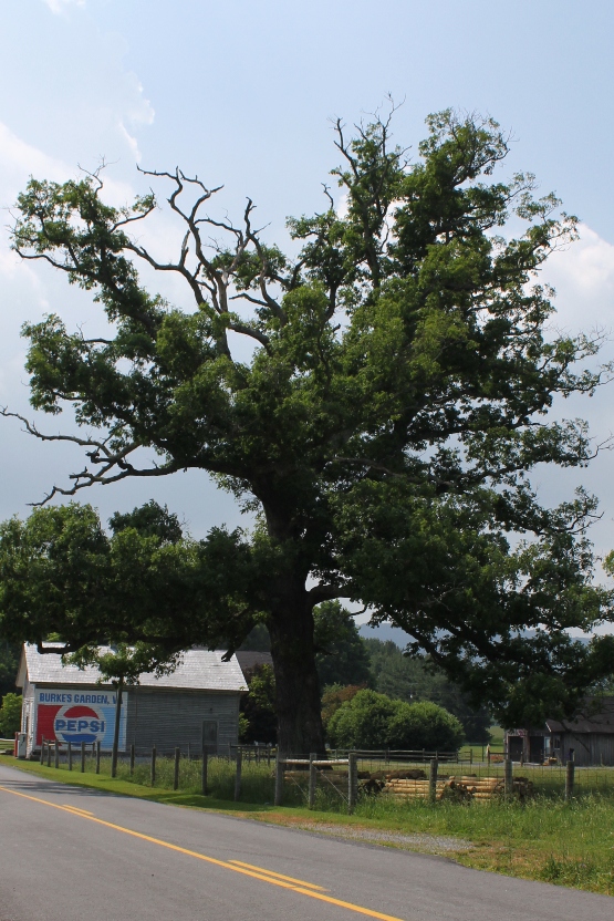 Burkes Garden Pepsi Sign June 12, 2011 555 × 832 Burkes Garden and The Varmint Half-Marathon A massive oak tree frames the Pepsi sign painted in the side of a closed gas station. Burkes Garden has dozens of huge oak trees along the country lanes and around the farms in the valley.