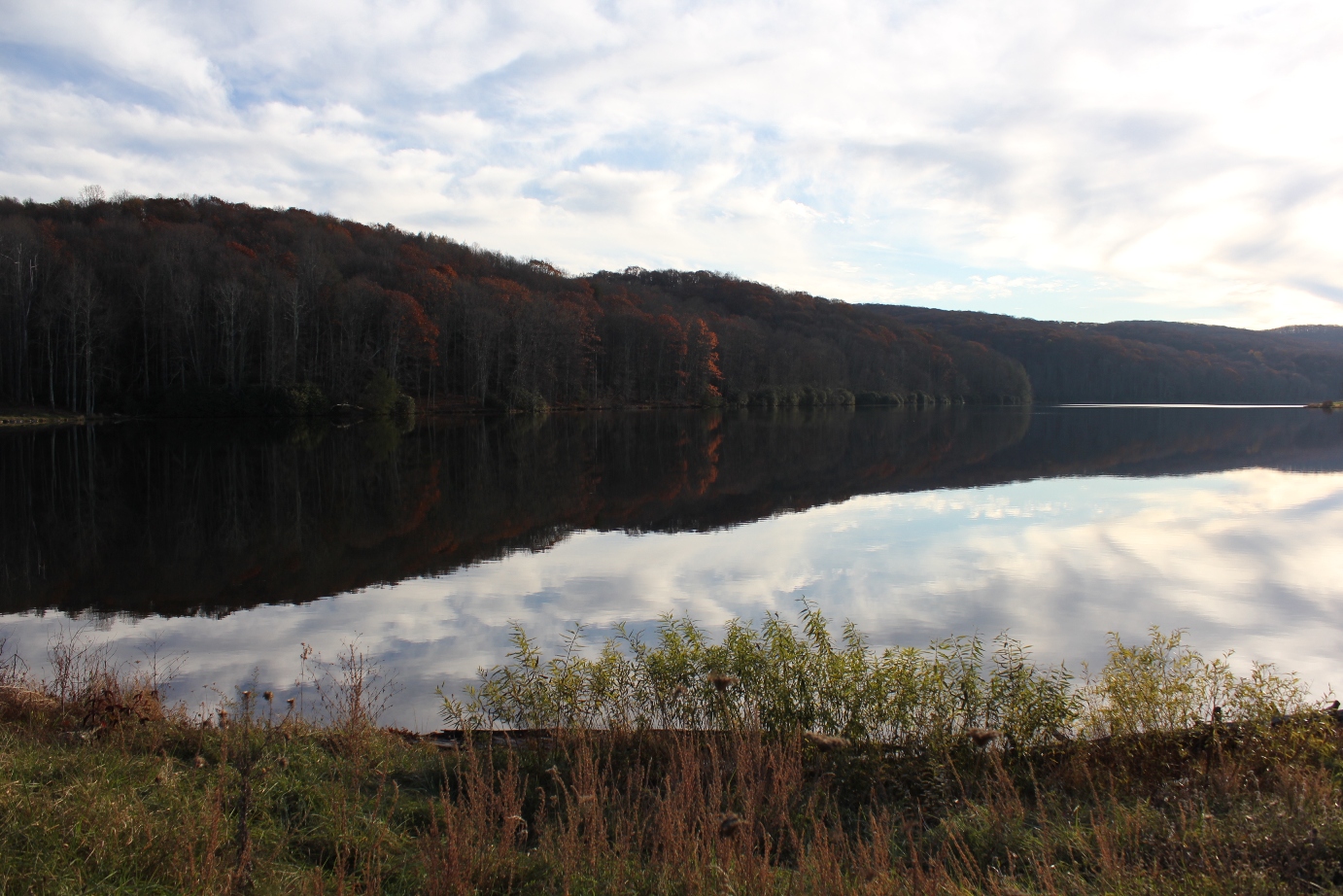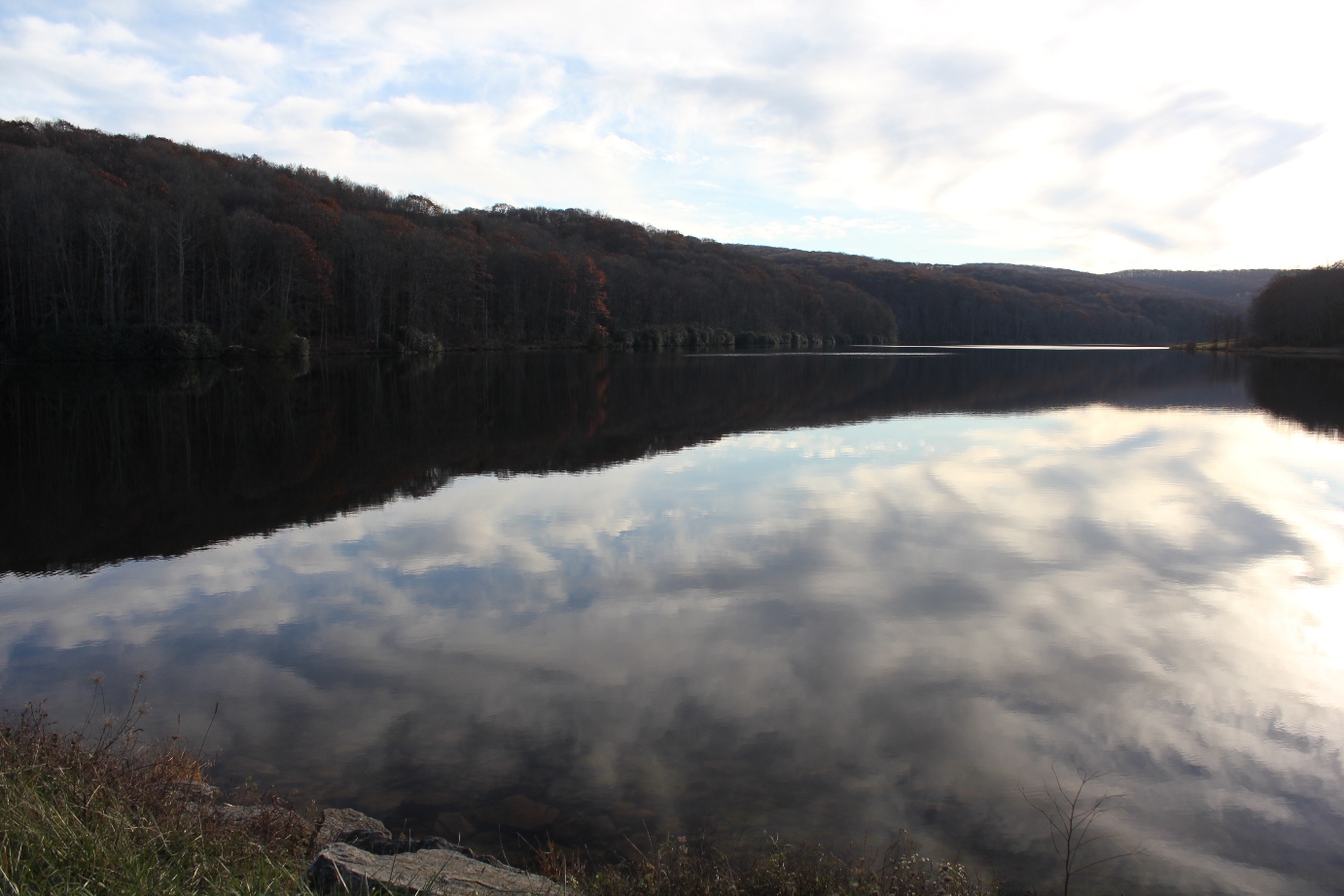The leaves had already mostly fallen, but as can be seen in the above photo, there were still oaks on the far side of the lake that clung to some of their dark auburn foliage.