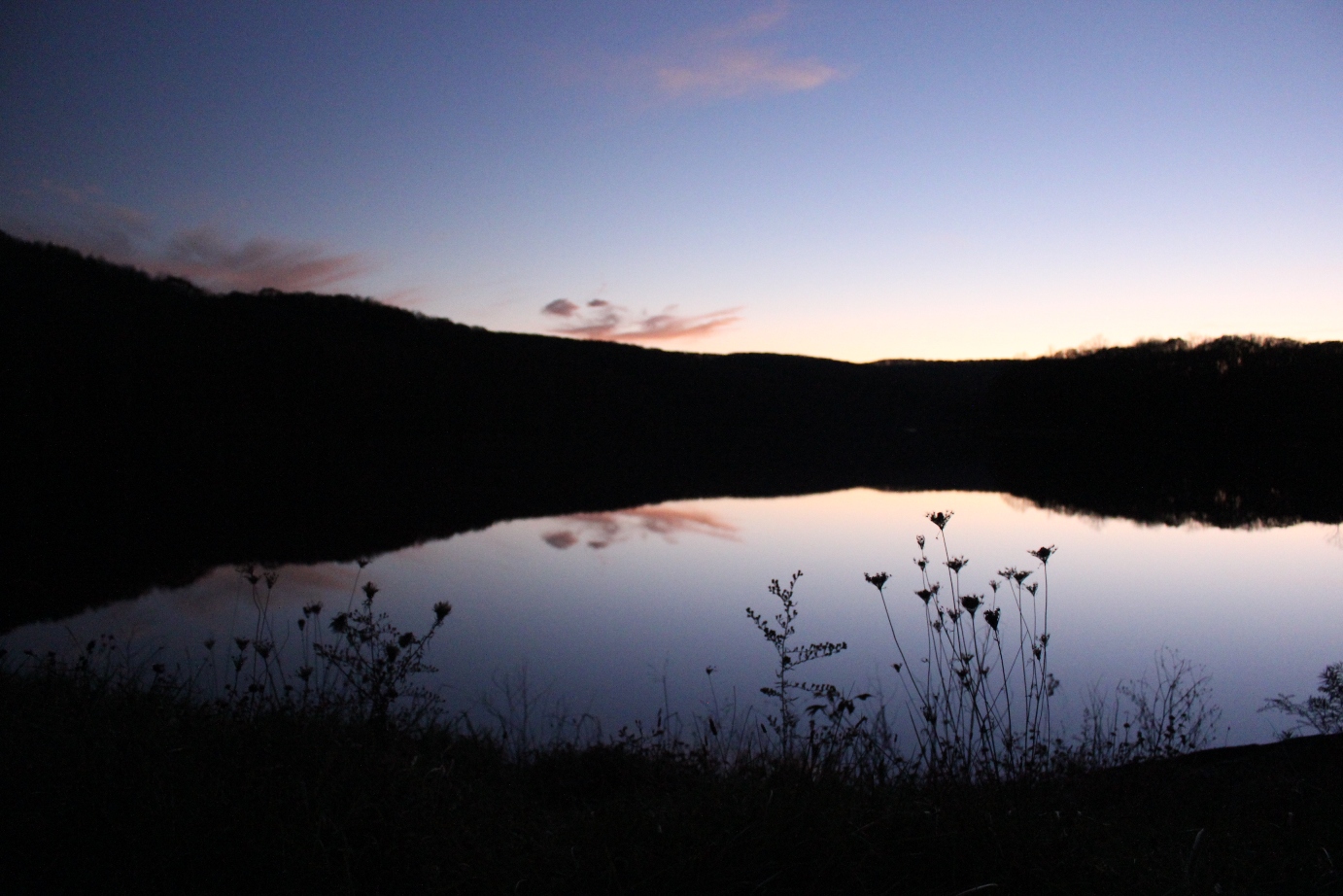 Upon our return, most of the clouds had rolled away. In the stillness of evening, the lake made an almost perfect reflecting pool. Faint light and muted features caused the scene to look like an impressionist painting: