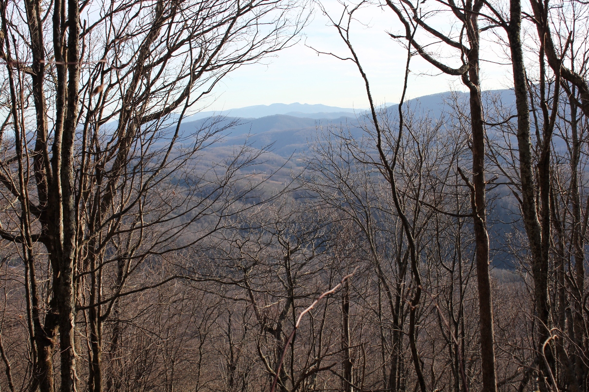 During the summer, this hike can be the quintessential AT walk through a “tunnel of trees” until you reach the very top. In winter, however, you can look up and down the mountain at the various boulders and formations, and you can peer deep into the forest. In the photo below, the leafless canopy affords a view of the top part of Grandfather Mountain in North Carolina. During summer you can’t see this until you get to the balds: