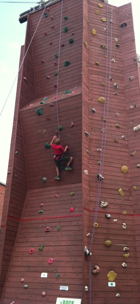The Footsloggers outdoor store in Boone, NC has a 40′ tall, 4000 square foot climbing tower. My son Isaac, age 9, enjoys climbing. Yesterday he did some climbing at the climbing tower. The tower is operated by Rock Dimensions, a climbing service in Boone.
